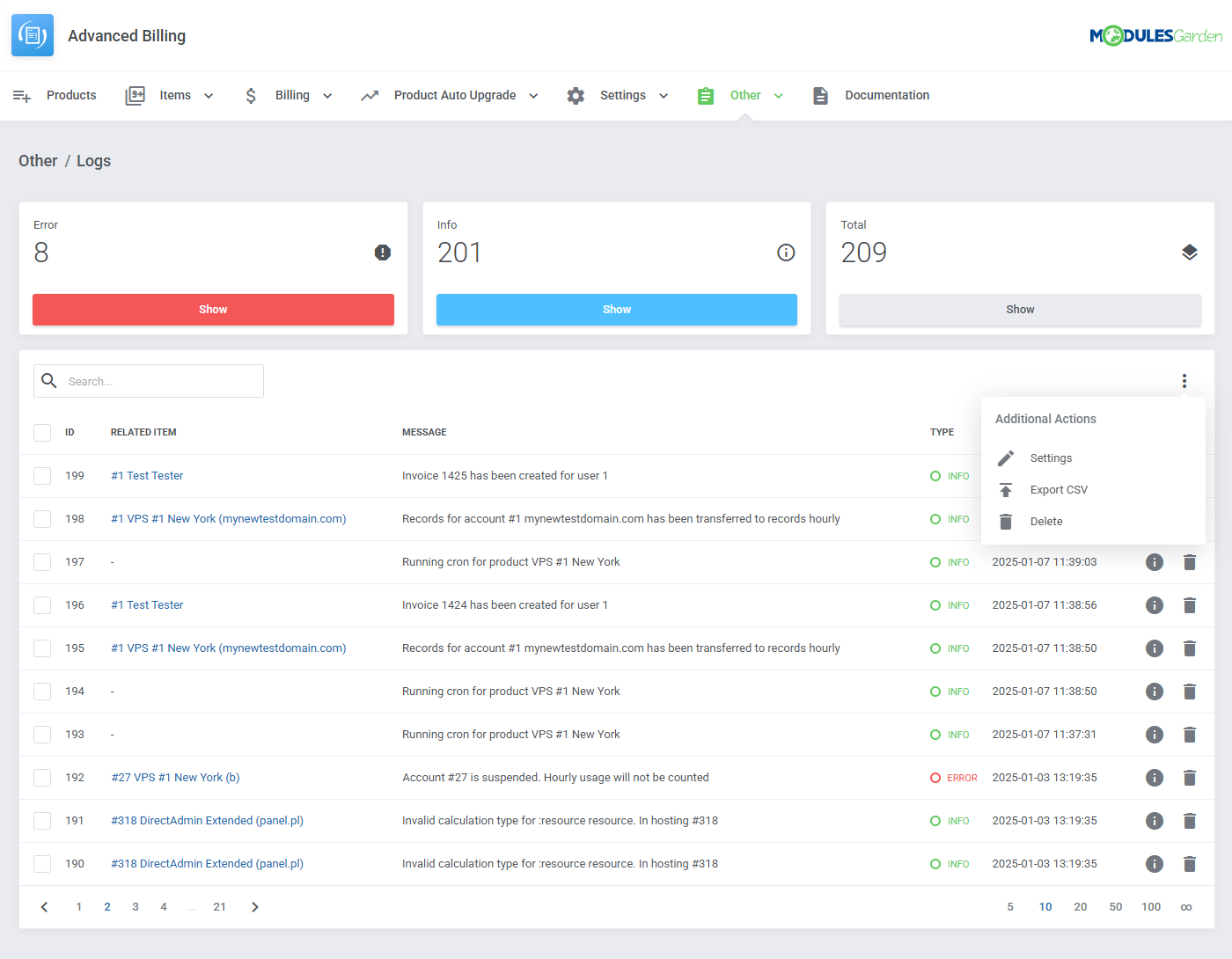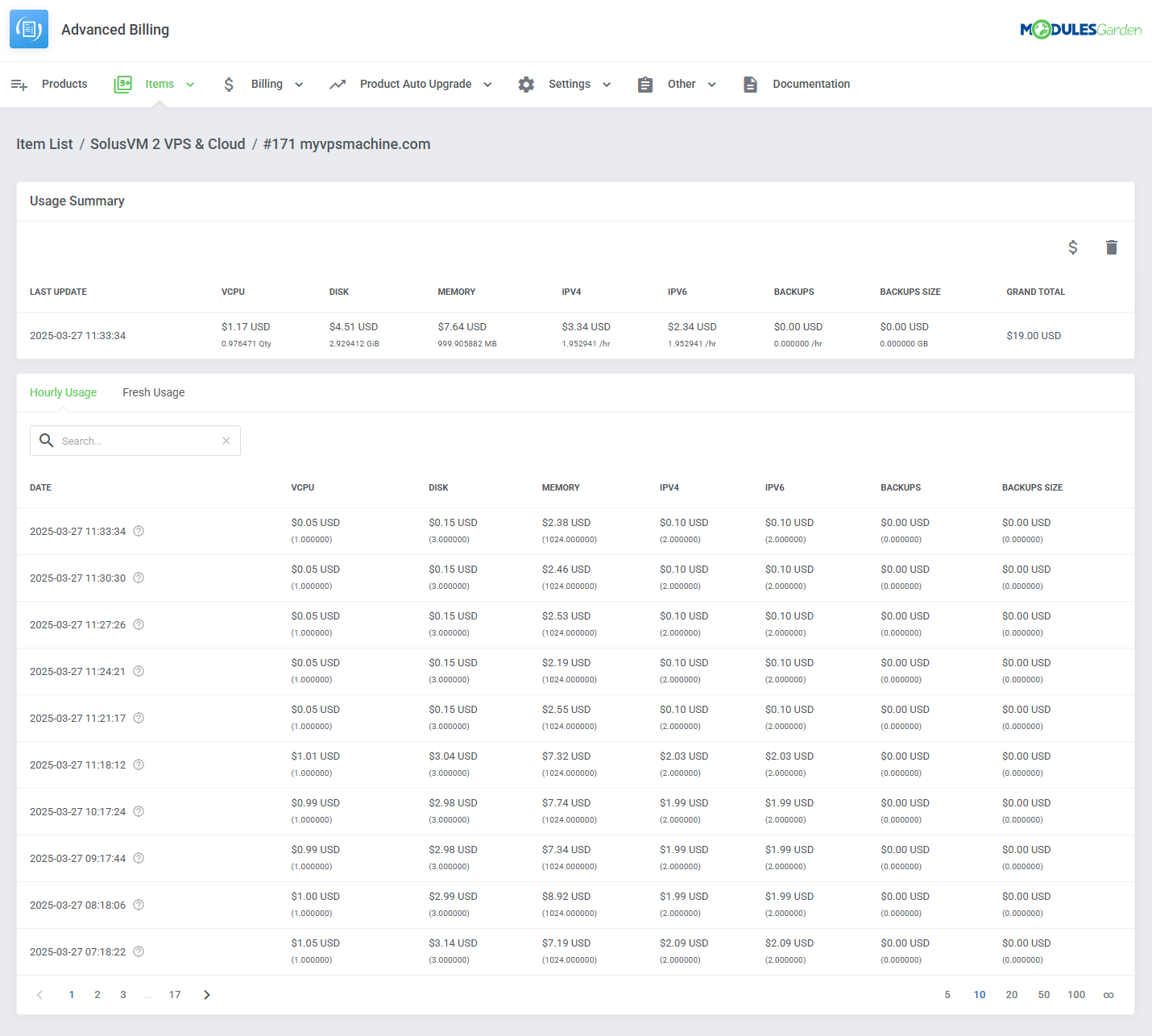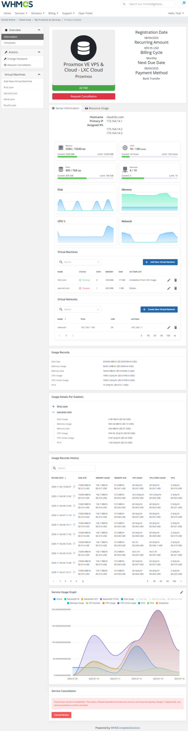 Advanced Billing para WHMCS te permite cobrar a tus clientes de forma dinámica por el uso real de recursos del servidor, tales como espacio en disco, ancho de banda o CPU. El módulo genera facturas dinámicamente para que tus clientes paguen por los recursos consumidos en los plazos y por los medios que tú configures.