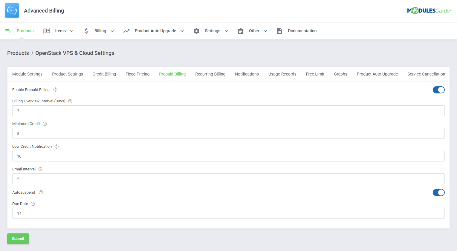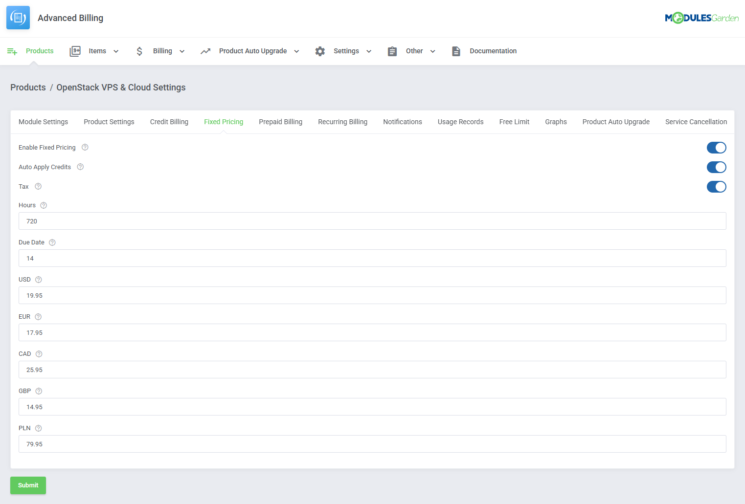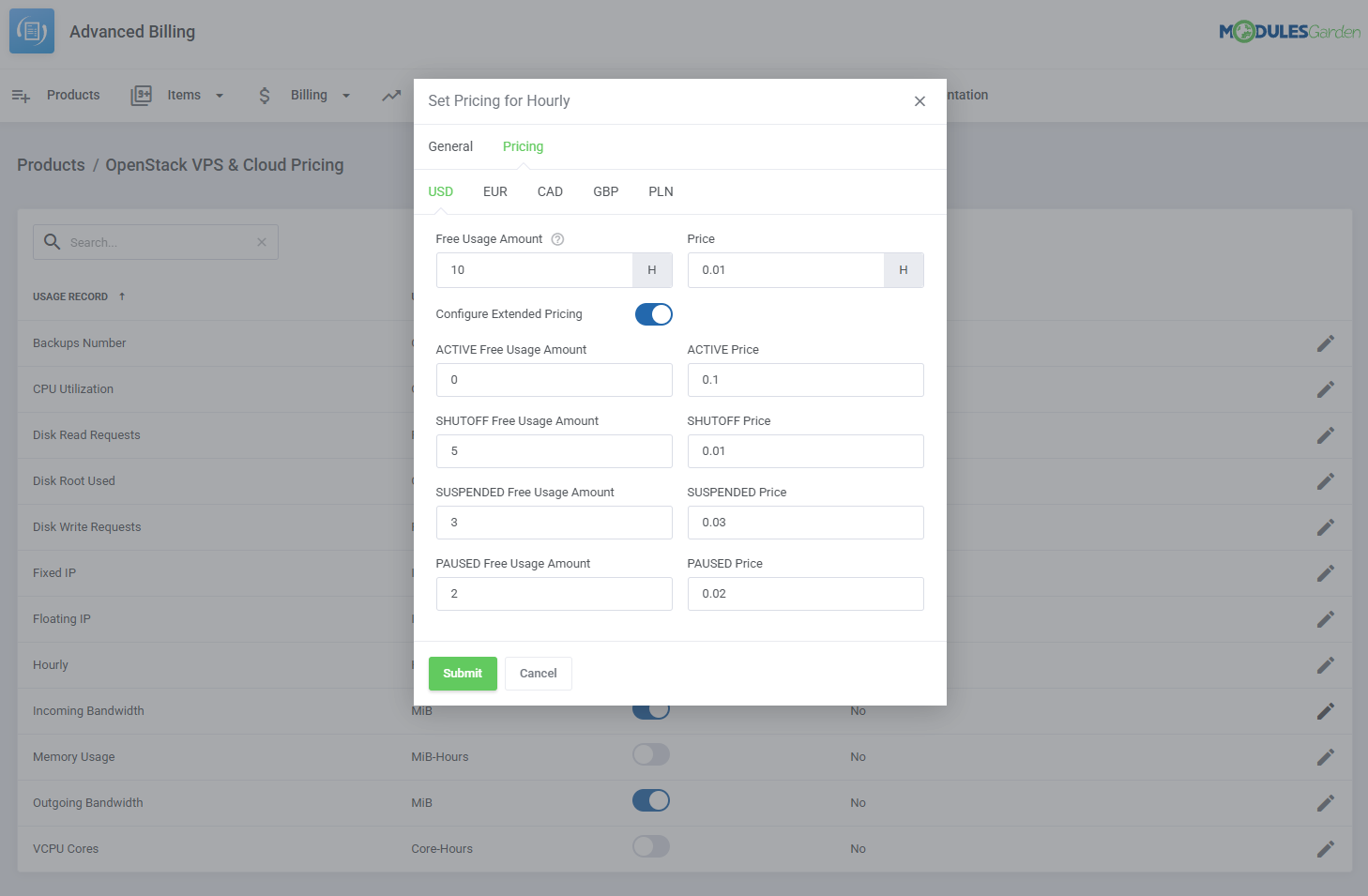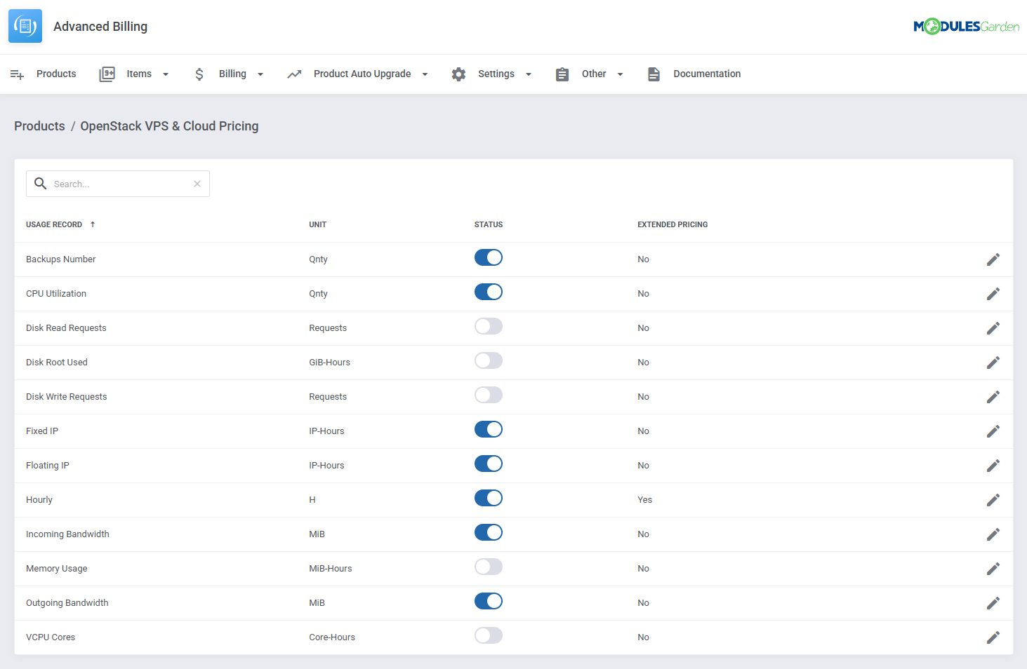 Este módulo soporta múltiples divisas y está integrado con casi 20 de los módulos mas famosos, incluyendo cPanel, Plesk, Proxmox VE y OpenStack. Podrás seleccionar de una gran variedad de alternativas avanzadas de cobro, tales como cobro por hora, por recursos usados, crédito y prepago, precios fijos e incluso modificar completamente los pagos recurrentes. Adicionalmente, los productos y sus opciones configurables pueden ser incrementados o decrementados en el siguiente cambio en base al consumo de recursos. Todavía mas, podrás ajustar todas las propiedades básicas de las facturas, así como definir características suplementarias, tales como un cargo mínimo para las facturas generadas. Al mismo tiempo, tus clientes podrán crear múltiples recordatorios por correo electrónico cuando se acerquen al límite lo excedan para cada recurso.