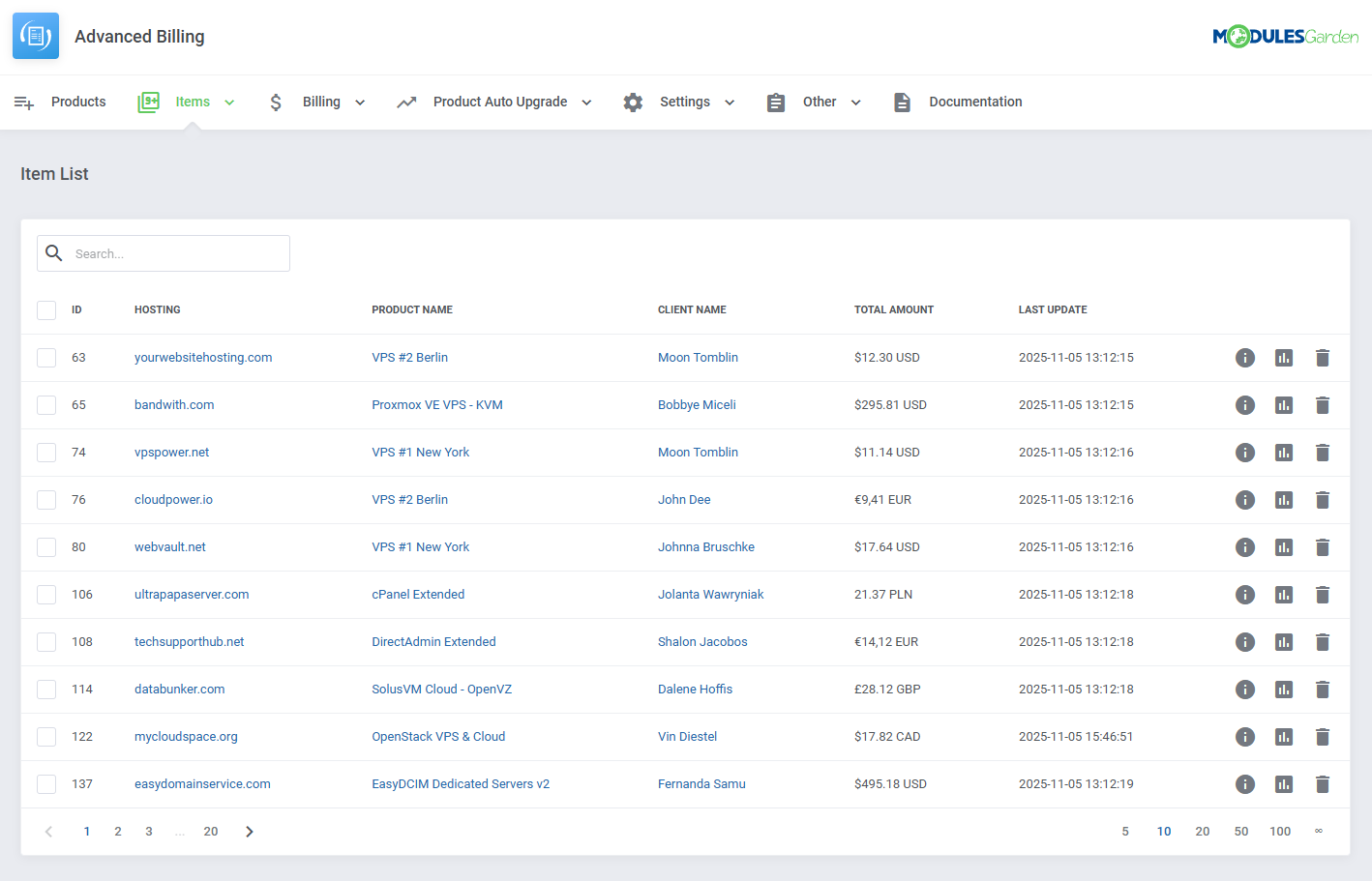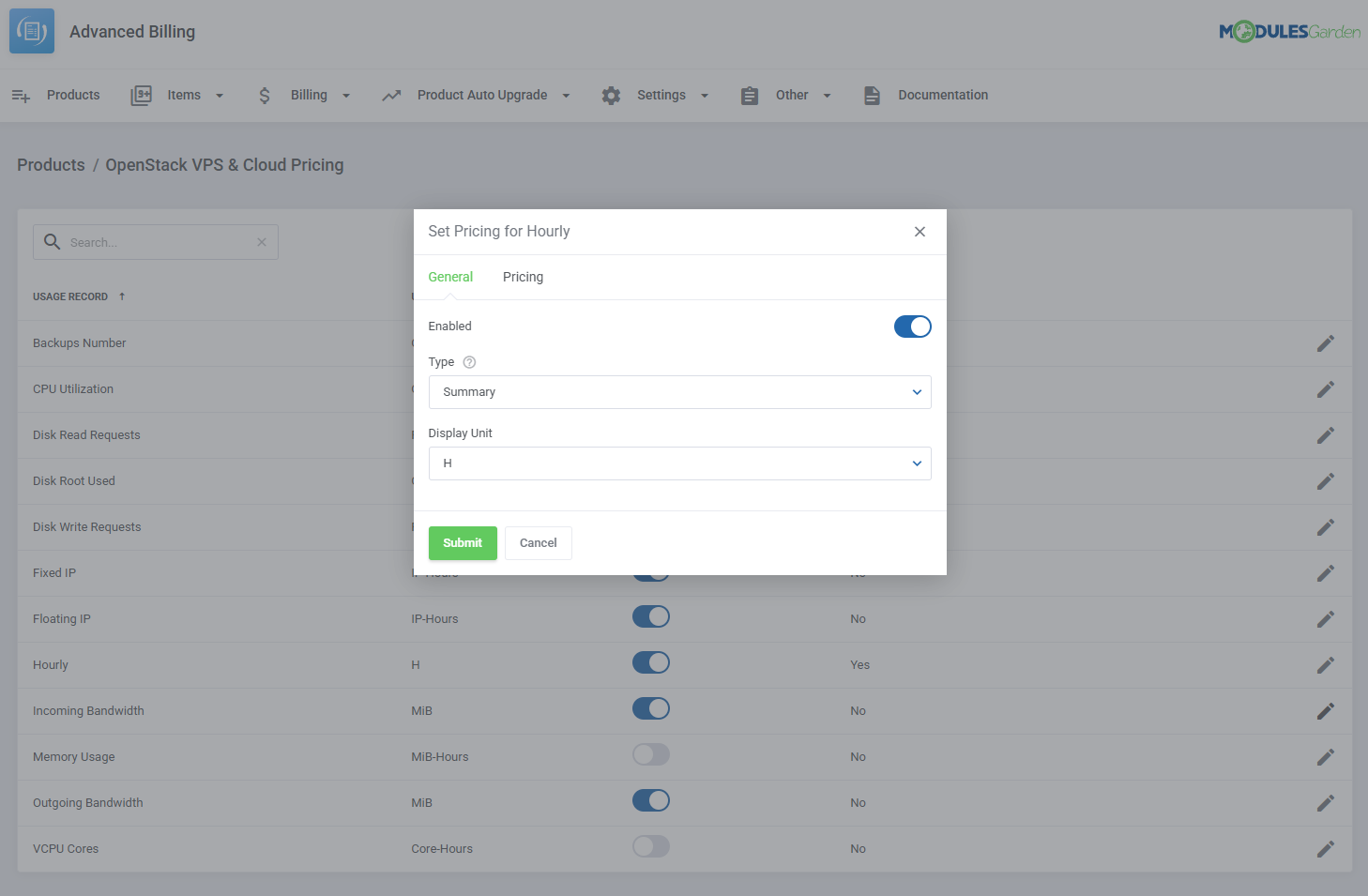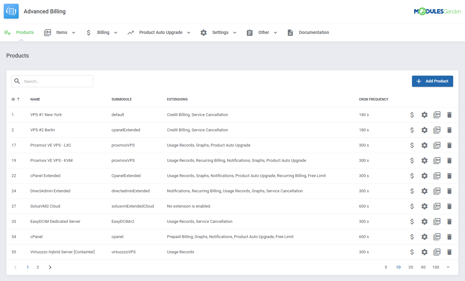 Este módulo soporta múltiples divisas y está integrado con casi 20 de los módulos mas famosos, incluyendo cPanel, Plesk, Proxmox VE y OpenStack. Podrás seleccionar de una gran variedad de alternativas avanzadas de cobro, tales como cobro por hora, por recursos usados, crédito y prepago, precios fijos e incluso modificar completamente los pagos recurrentes. Adicionalmente, los productos y sus opciones configurables pueden ser incrementados o decrementados en el siguiente cambio en base al consumo de recursos. Todavía mas, podrás ajustar todas las propiedades básicas de las facturas, así como definir características suplementarias, tales como un cargo mínimo para las facturas generadas. Al mismo tiempo, tus clientes podrán crear múltiples recordatorios por correo electrónico cuando se acerquen al límite lo excedan para cada recurso.