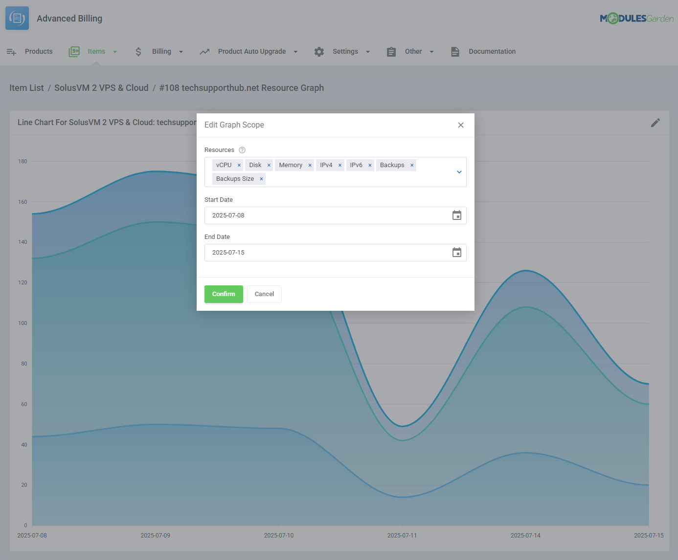 Como un beneficio adicional, tanto tú como tus clientes podrán configurar gráficas dinámicas mostrando el uso de recursos para cada servicio.
