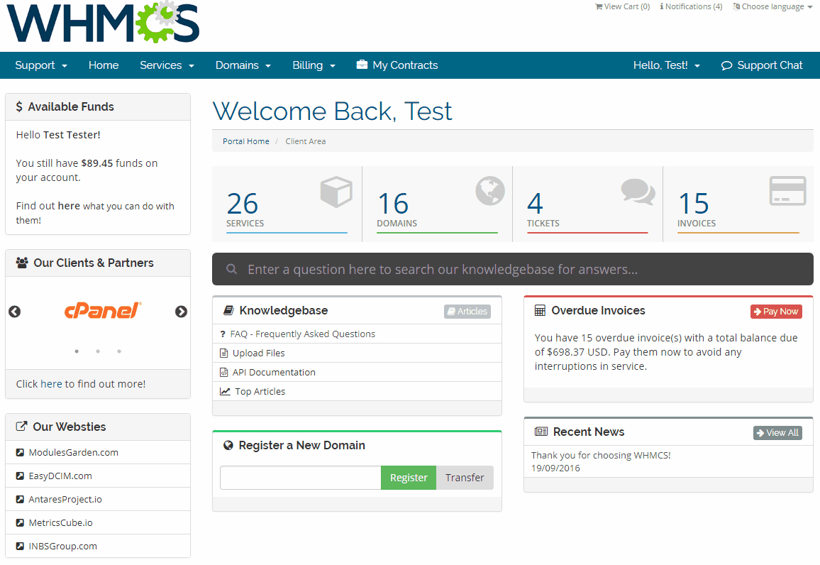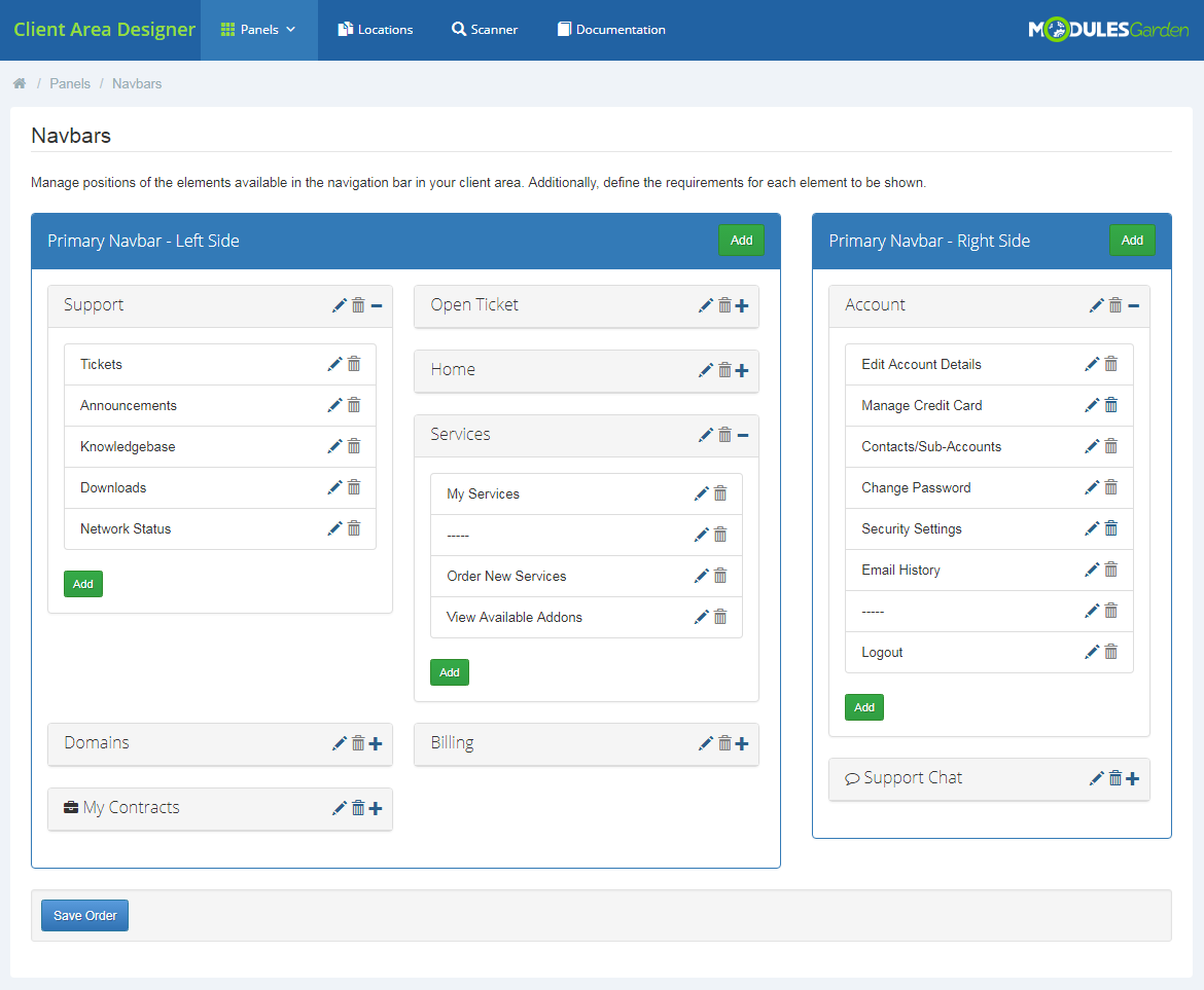 Client Area Designer para WHMCS es una herramienta altamente conveniente que te permite personalizar el diseño del área de clientes de tu WHMCS. Todos los elementos pueden ser reordenados y controlados con un editor que te permite arrastrar y soltar en tan solo unos segundos. Además podrás ajustar los nombres y contenido de los paneles existentes así como agregar nuevos a los que desees que tus clientes tengan acceso.