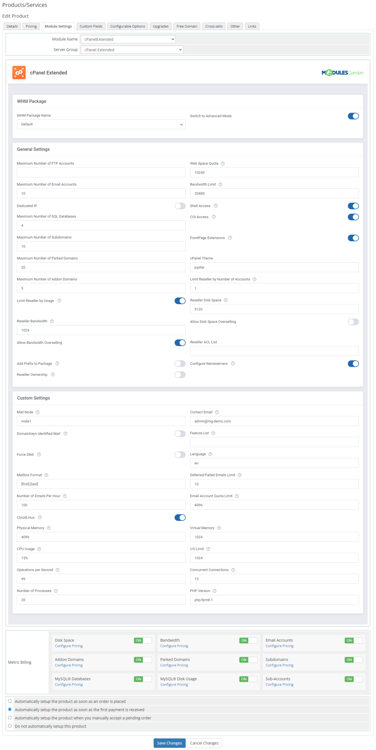 El atractivo en cuanto a ahorro de tiempo de cPanel Extended para WHMCS se basa en que te permite configurar productos prediseñados en tu sistema y configurarlos de la misma forma que configuras paquetes en cPanel. Podrás personalizar el enfoque de herramientas disponibles para tus clientes, así como limitar los recursos que cada uno de ellos puede consumir con CloudLinux.