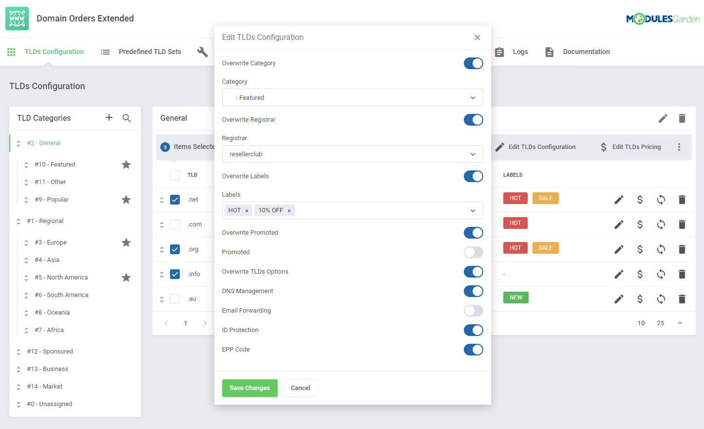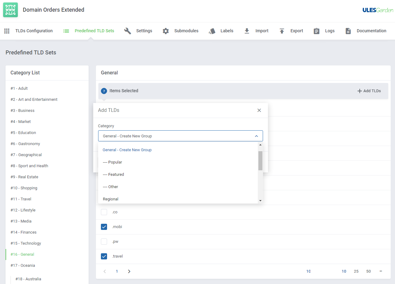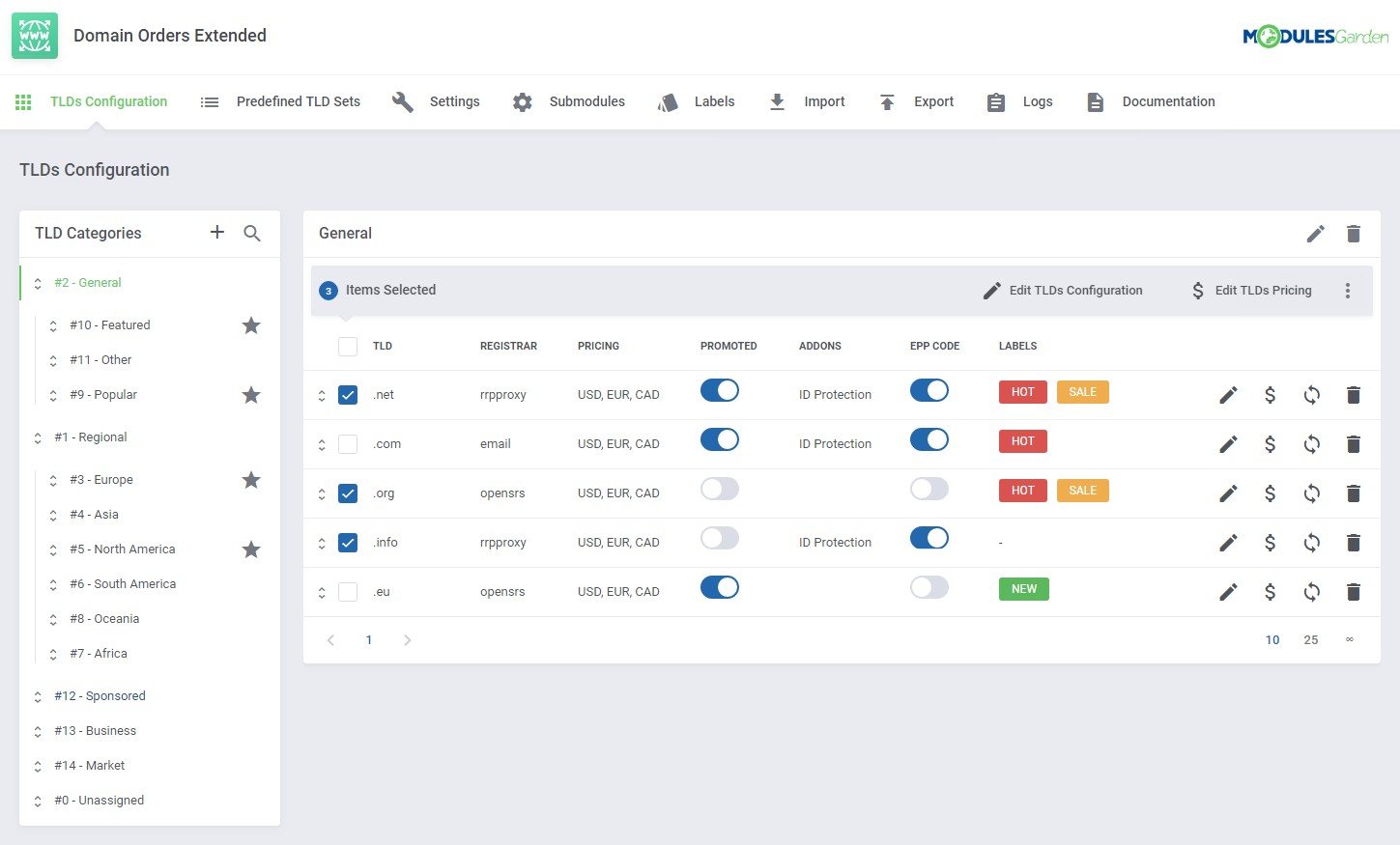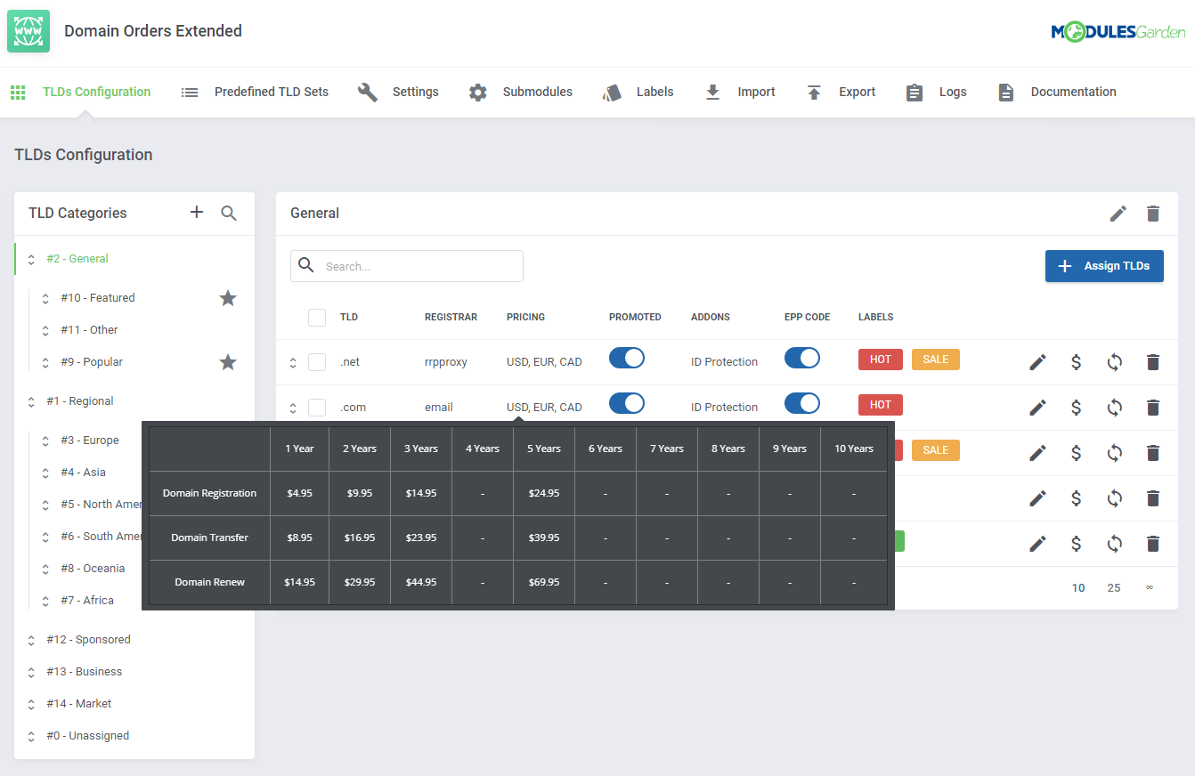 Domain Orders Extended para WHMCS incrementa la colección de herramientas para búsqueda de dominios en tu sistema, permitiéndote organizar los tipos de dominios por categorías y ejecutar acciones por lotes en dichos dominios.