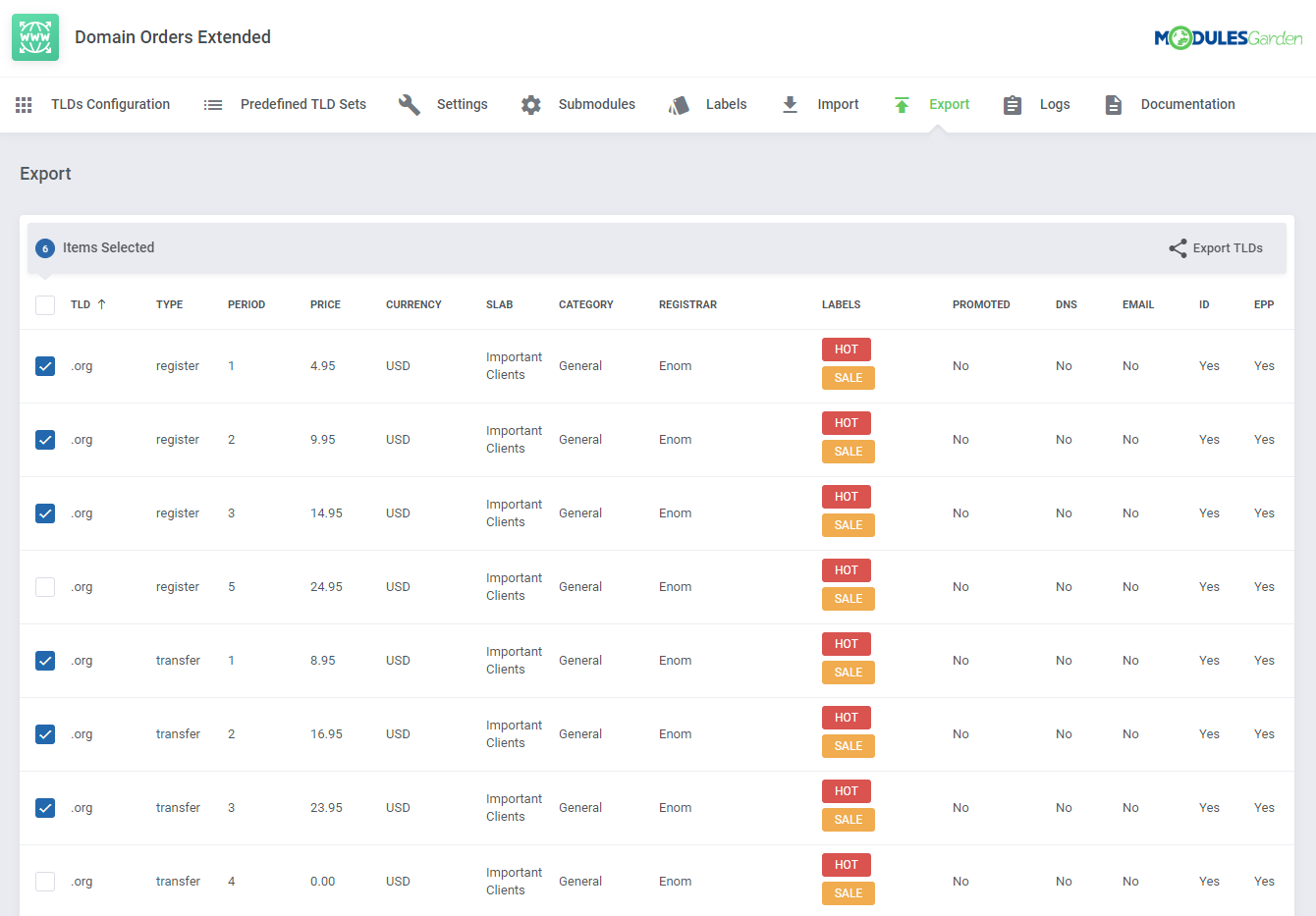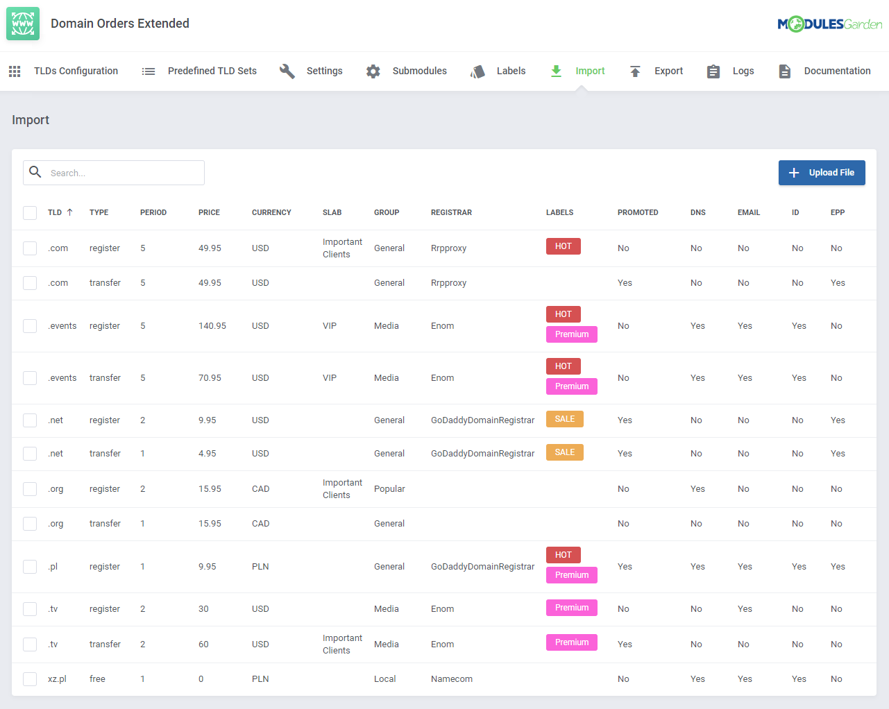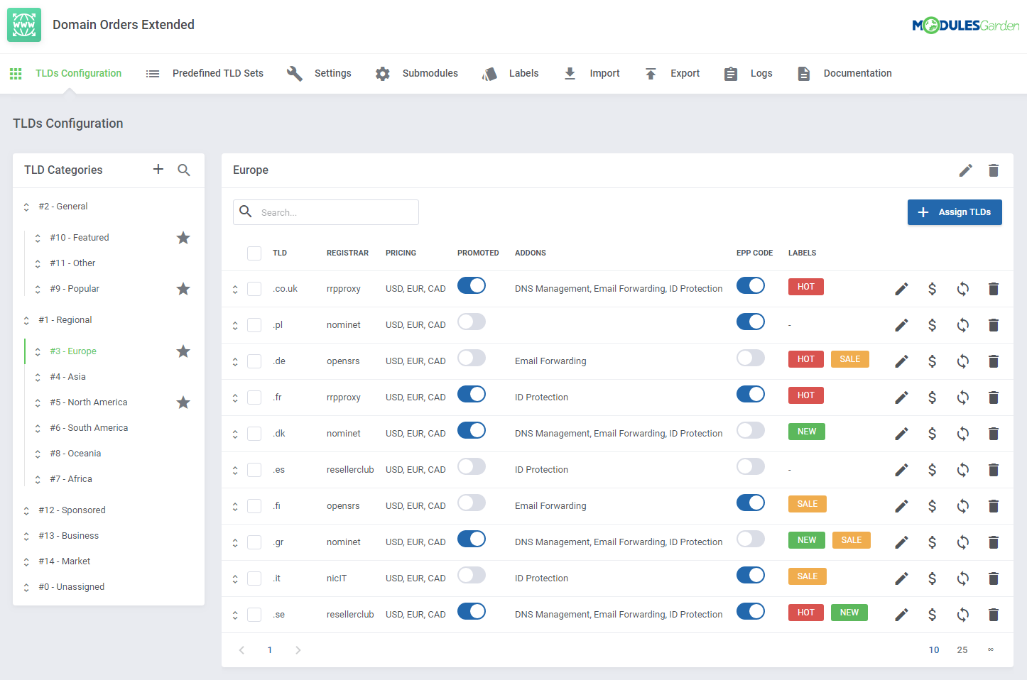 Domain Orders Extended para WHMCS incrementa la colección de herramientas para búsqueda de dominios en tu sistema, permitiéndote organizar los tipos de dominios por categorías y ejecutar acciones por lotes en dichos dominios.