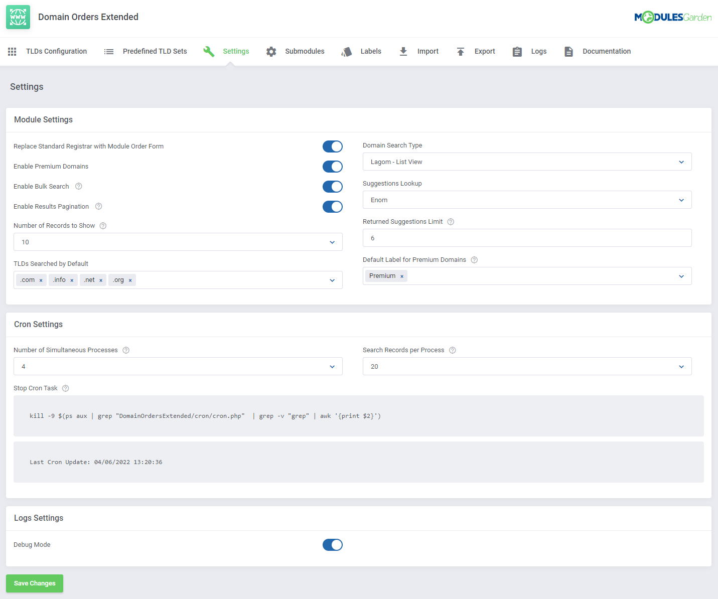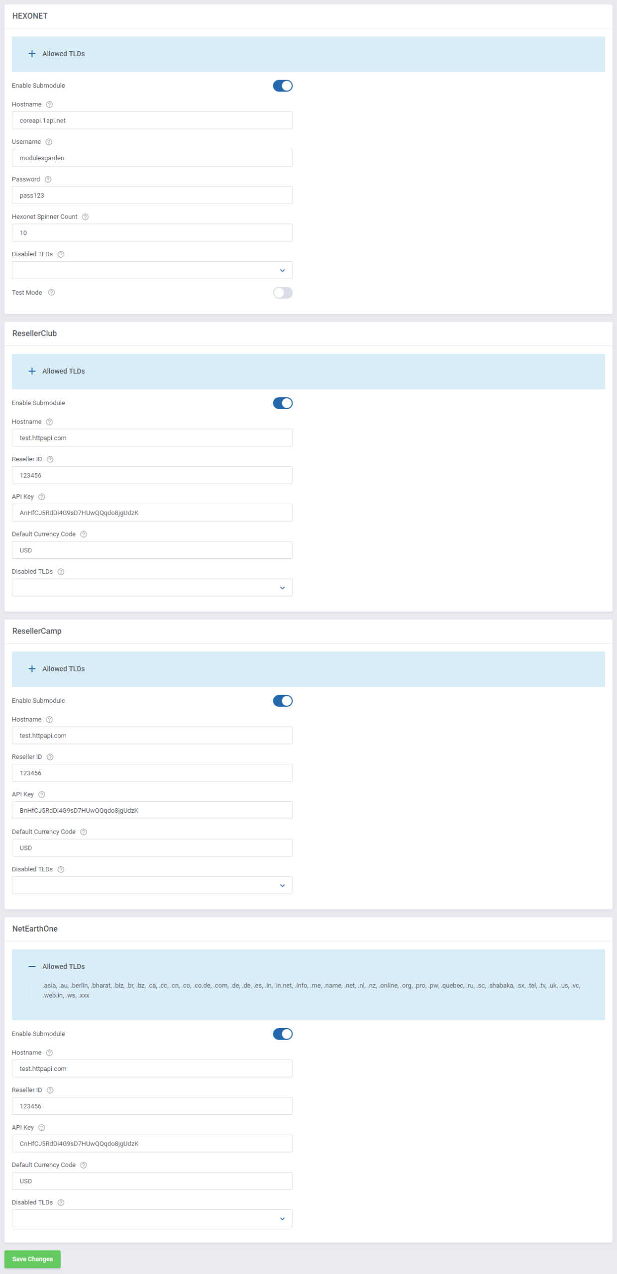 Podrás configurar tus propios submódulos de búsqueda de dominio o elegir entre los 7 predefinidos, que incluyen el altamente respetado Enom, ResellerClub y OpenSRS.