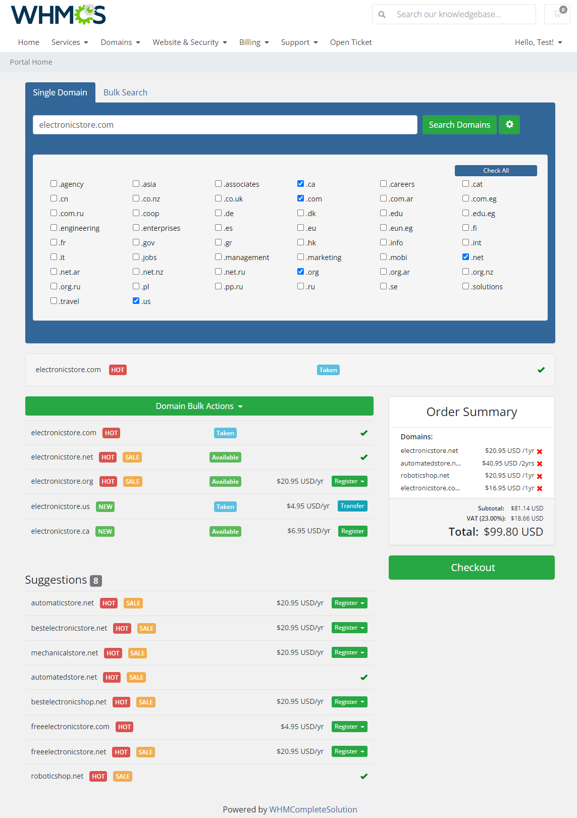 Tus clientes podrán realizar búsquedas por lotes, así como búsquedas múltiples y operaciones de compra de dominios, todo desde tu sistema WHMCS y con una sola petición. Para hacer la elección mas fácil, se les ofrecerán sugerencias de dominios generadas por el aleatorizador integrado del proveedor de dominios seleccionado.