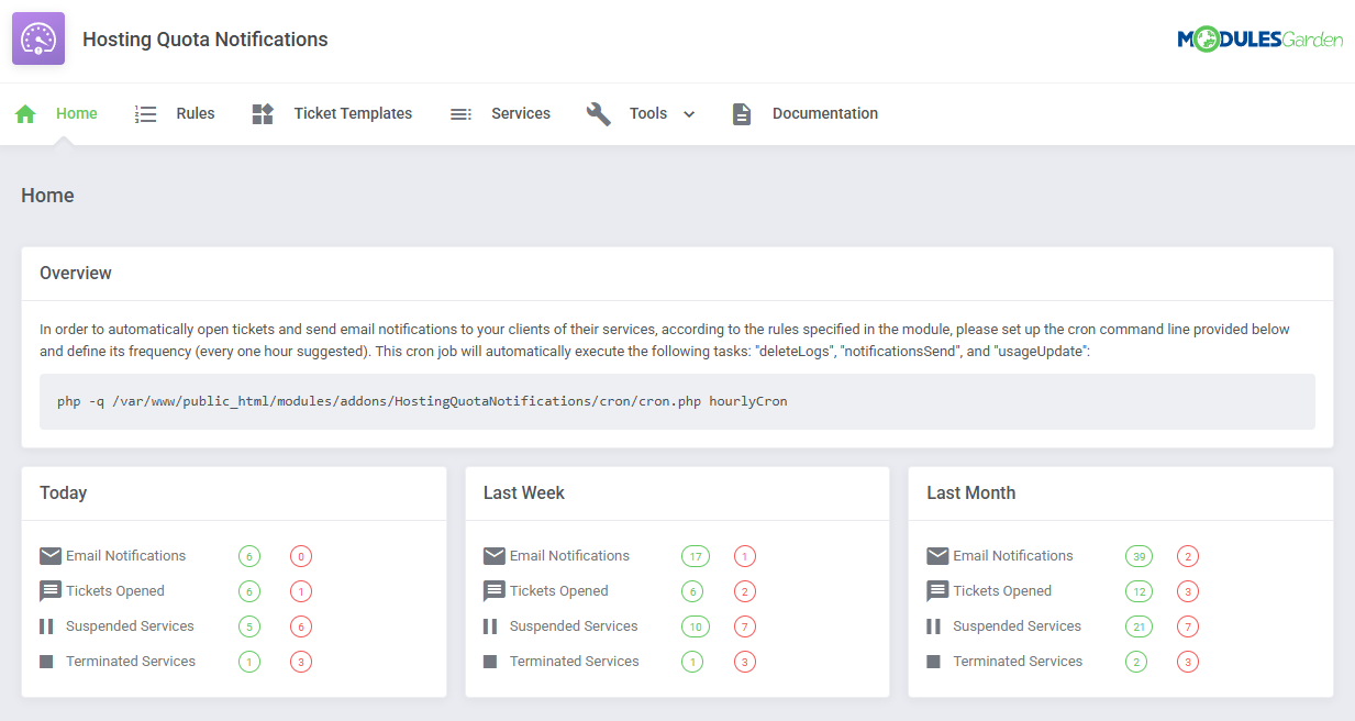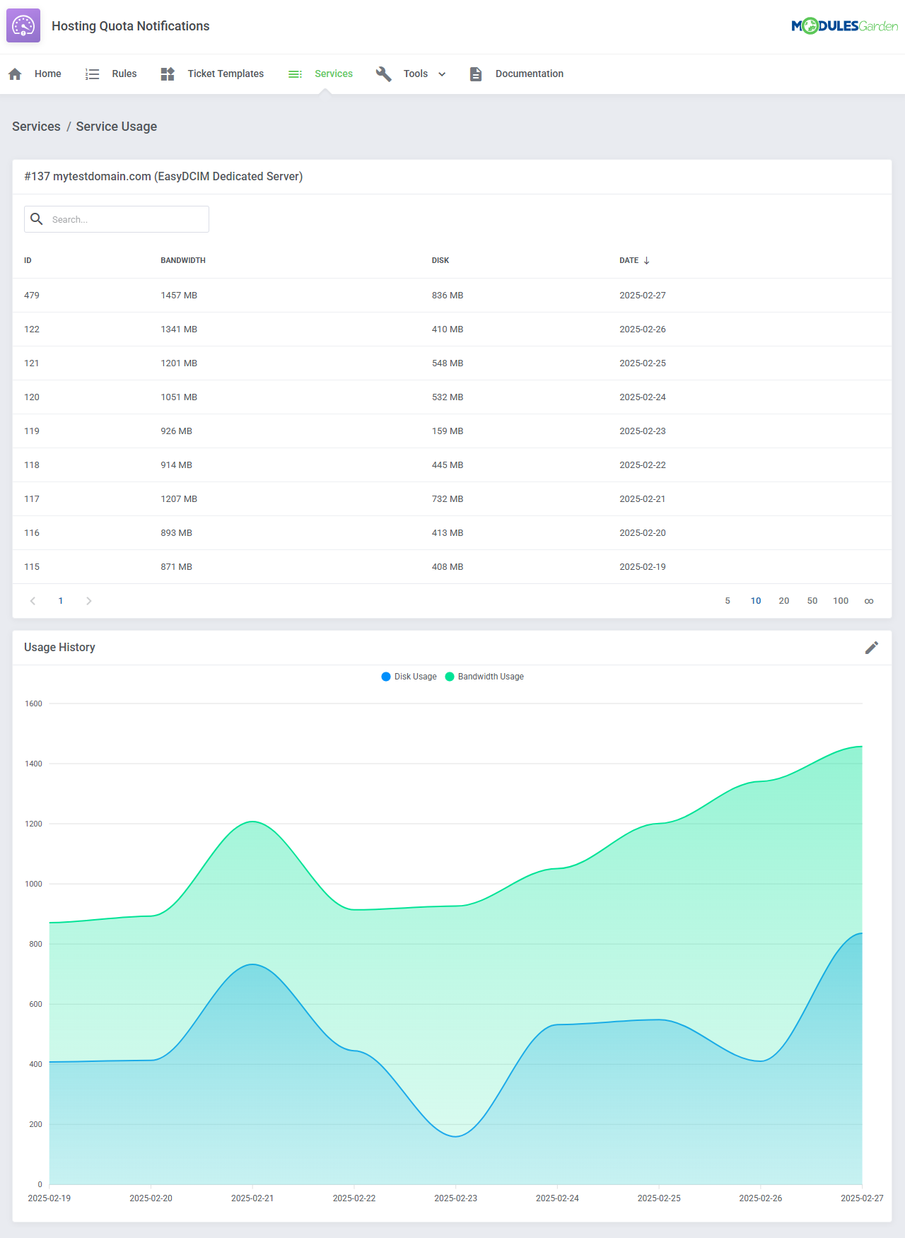 Hosting Quota Notifications para WHMCS introduce mensajes ajustables que son enviados automáticamente a tus clientes cuando exceden el ancho de banda o espacio en disco asignados de acuerdo con criterios predefinidos.