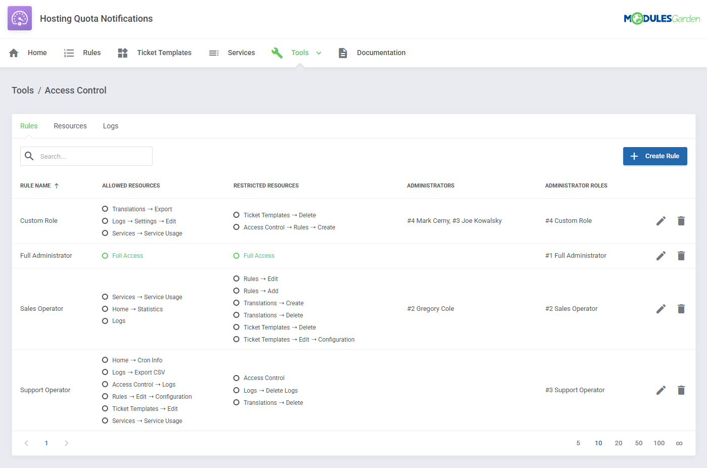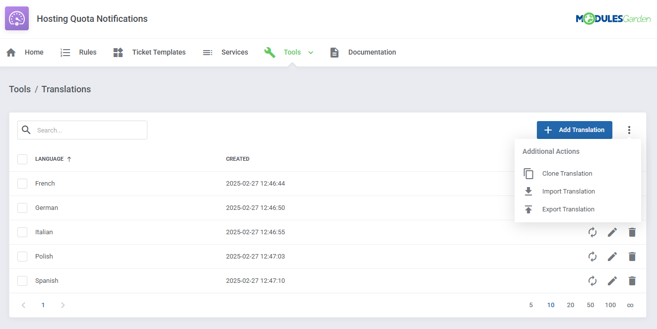 Cada alerta puede ser creada en diferentes idiomas y enviada por medio de correo electrónico o ticket de soporte. Adicionalmente, puedes elegir si el producto o servicio debe ser suspendido automáticamente o cancelado si se cumple la regla de la notificación.