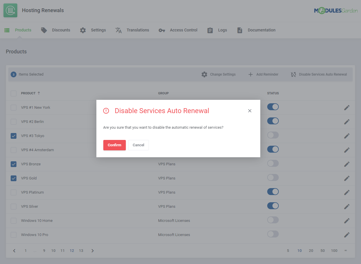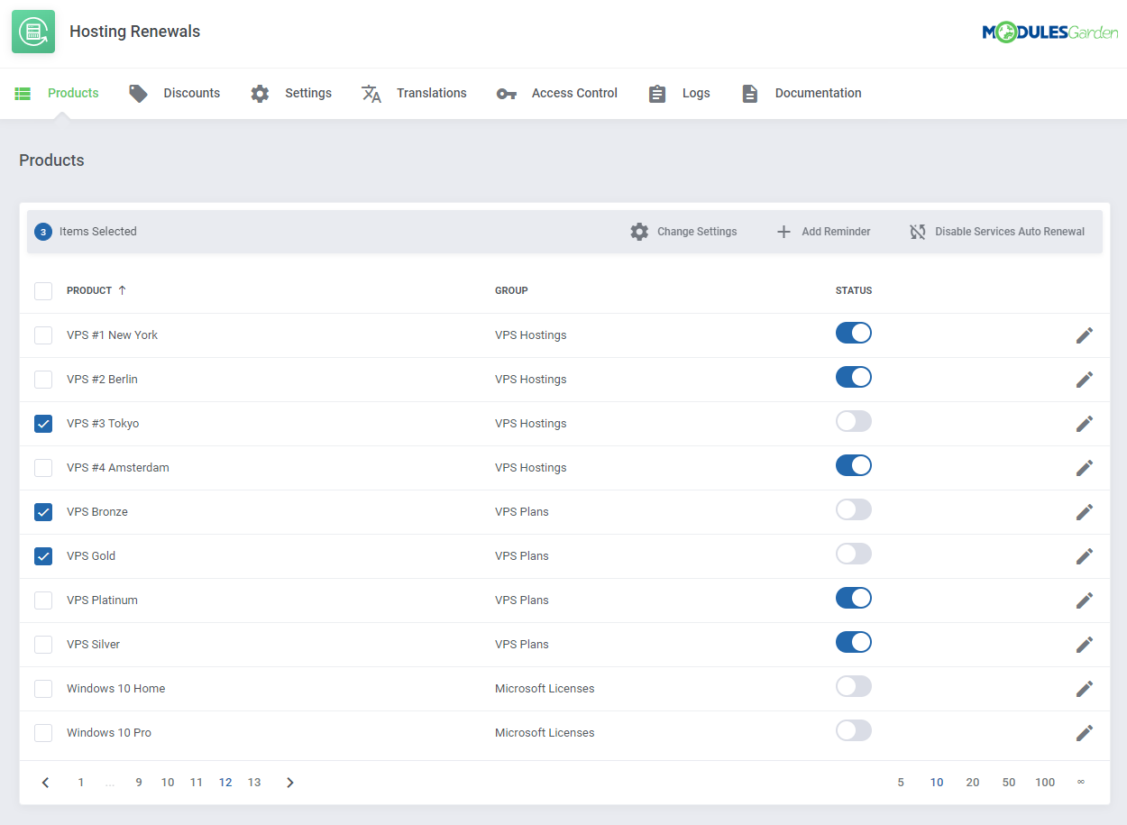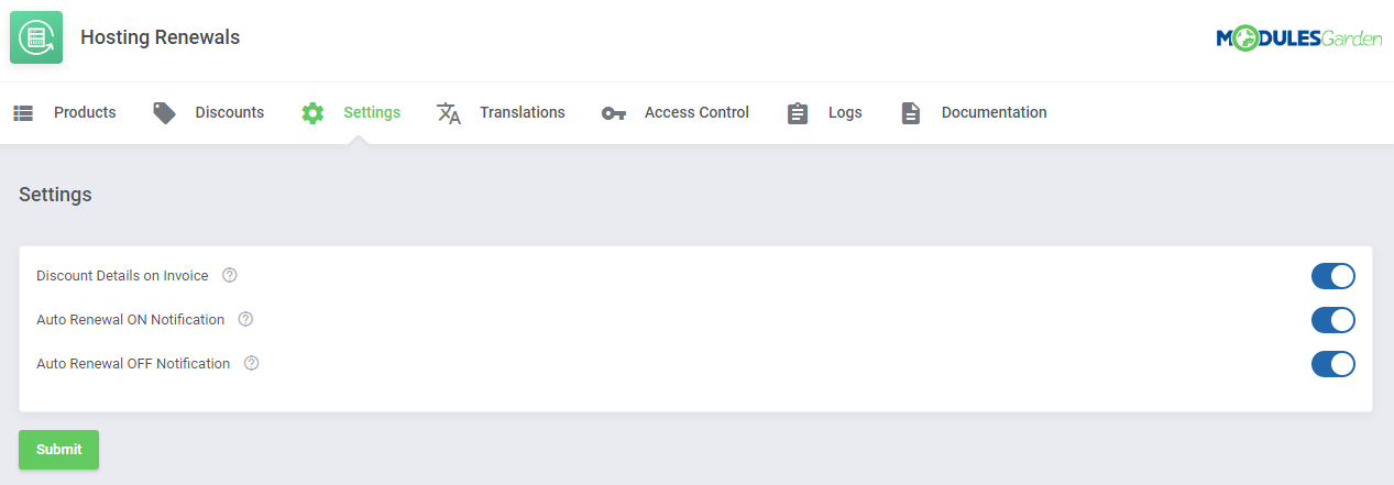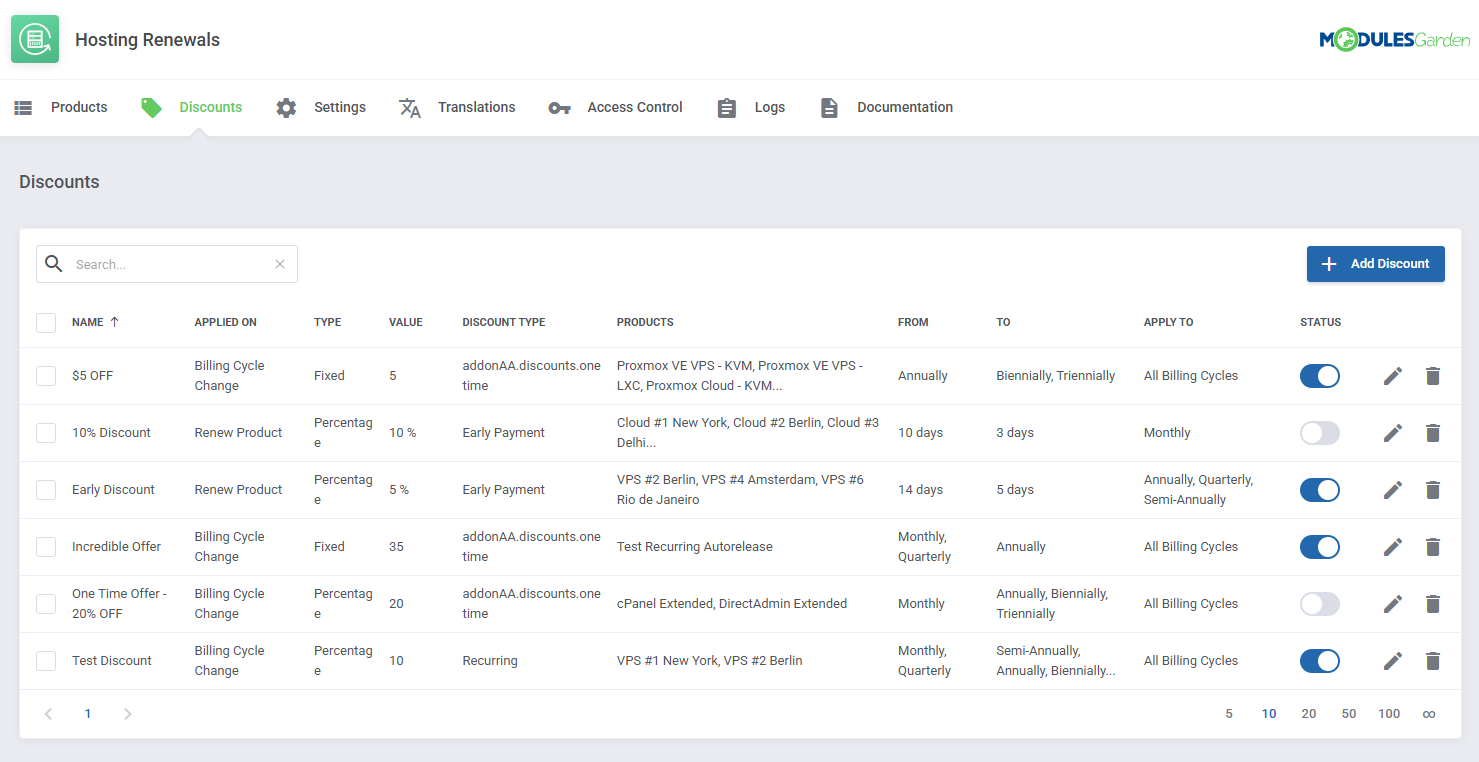 Hosting Renewals para WHMCS es un módulo extraordinariamente útil que permite a tus clientes administrar los ciclos de facturación y los pagos recurrentes de formas nunca antes posibles. En esencia, podrán habilitar o deshabilitar renovaciones automáticas, pero también podrán renovar servicios antes de su fecha de vencimiento, así como cambiar el ciclo de facturación de cada producto contratado.