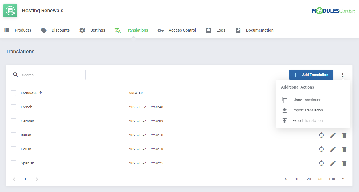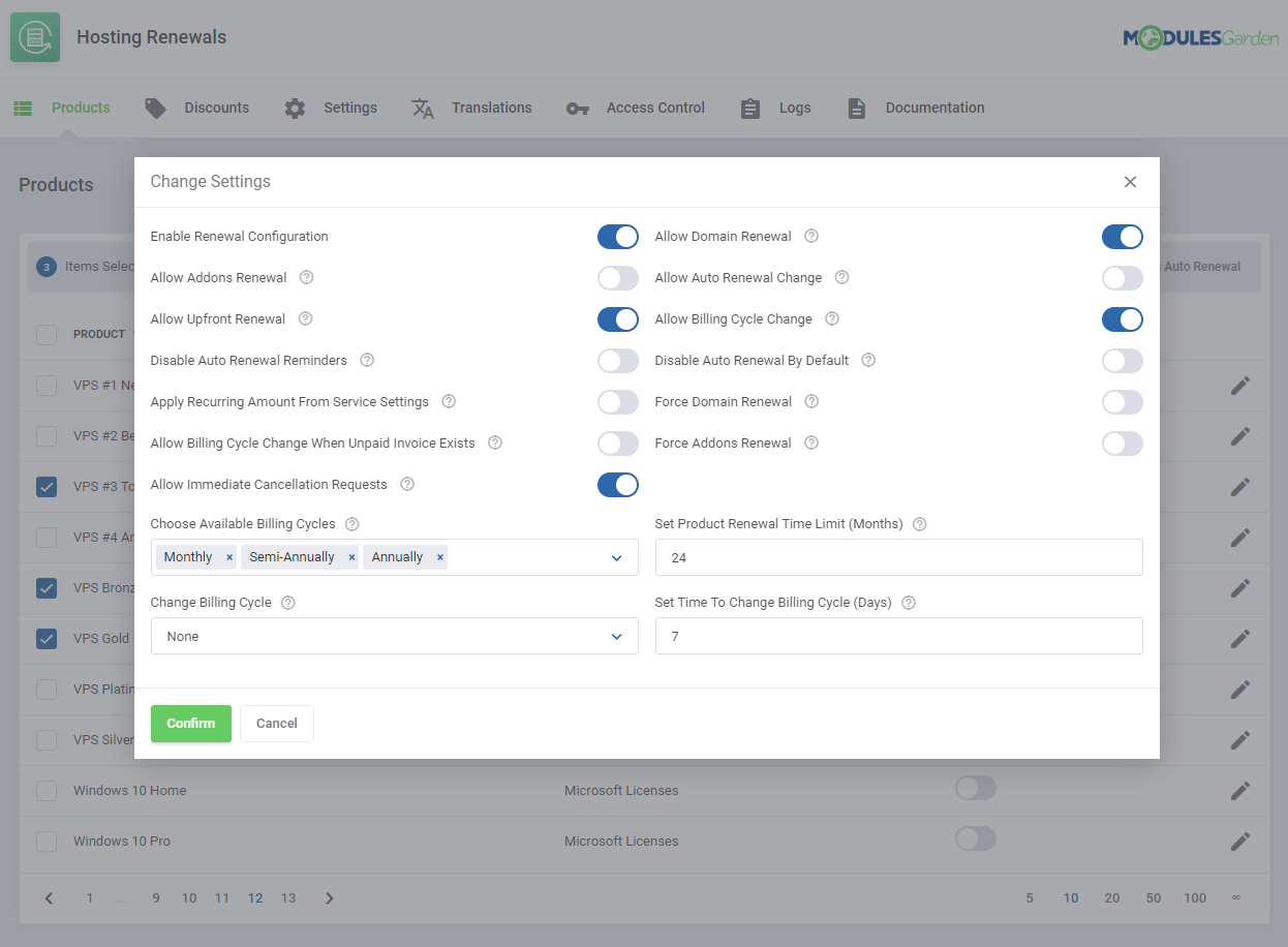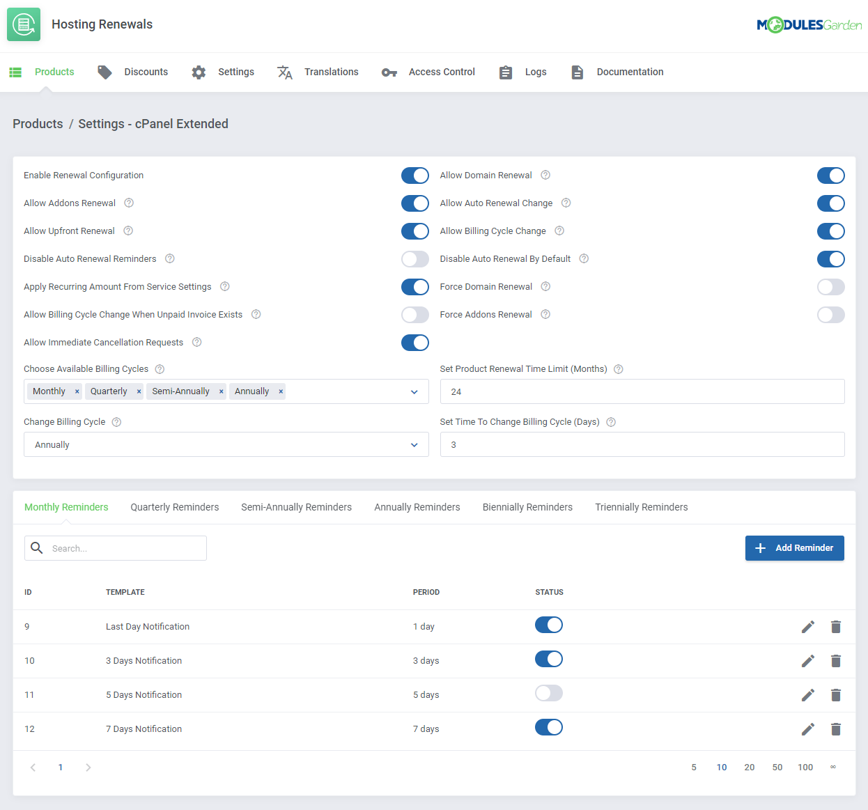 Adicionalmente, cada producto puede tener un límite de tiempo diferente para el periodo de renovación. También puedes decidir si los addons y dominios deben ser renovados con el servicio al que pertenecen, o incluso forzar la ejecución de dichas operaciones cuando sea requerido. Por último, podrás redactar y enviar notificaciones por correo personalizadas y recordar a tus clientes de futuras renovaciones.