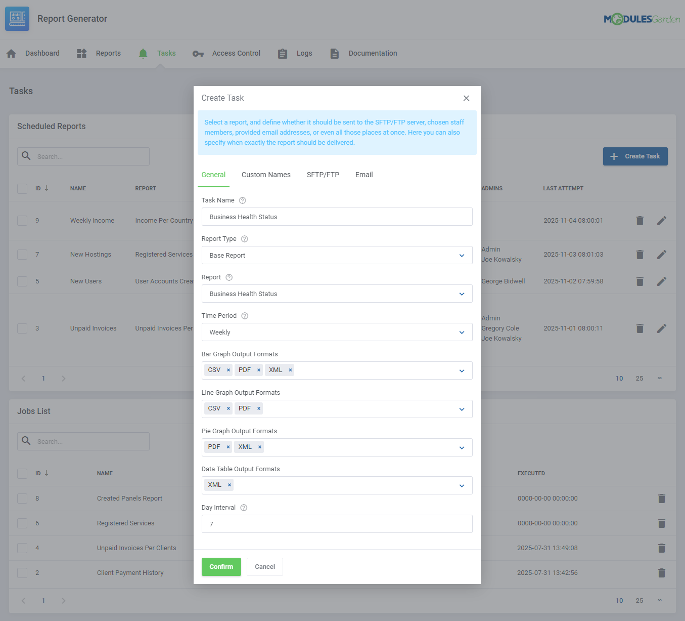 Además, este módulo te permitirá programar la creación y envío de los reportes seleccionados, tanto pre-diseñados como personalizados, vía correo o transferirlos por medio de FTP/SFTP.