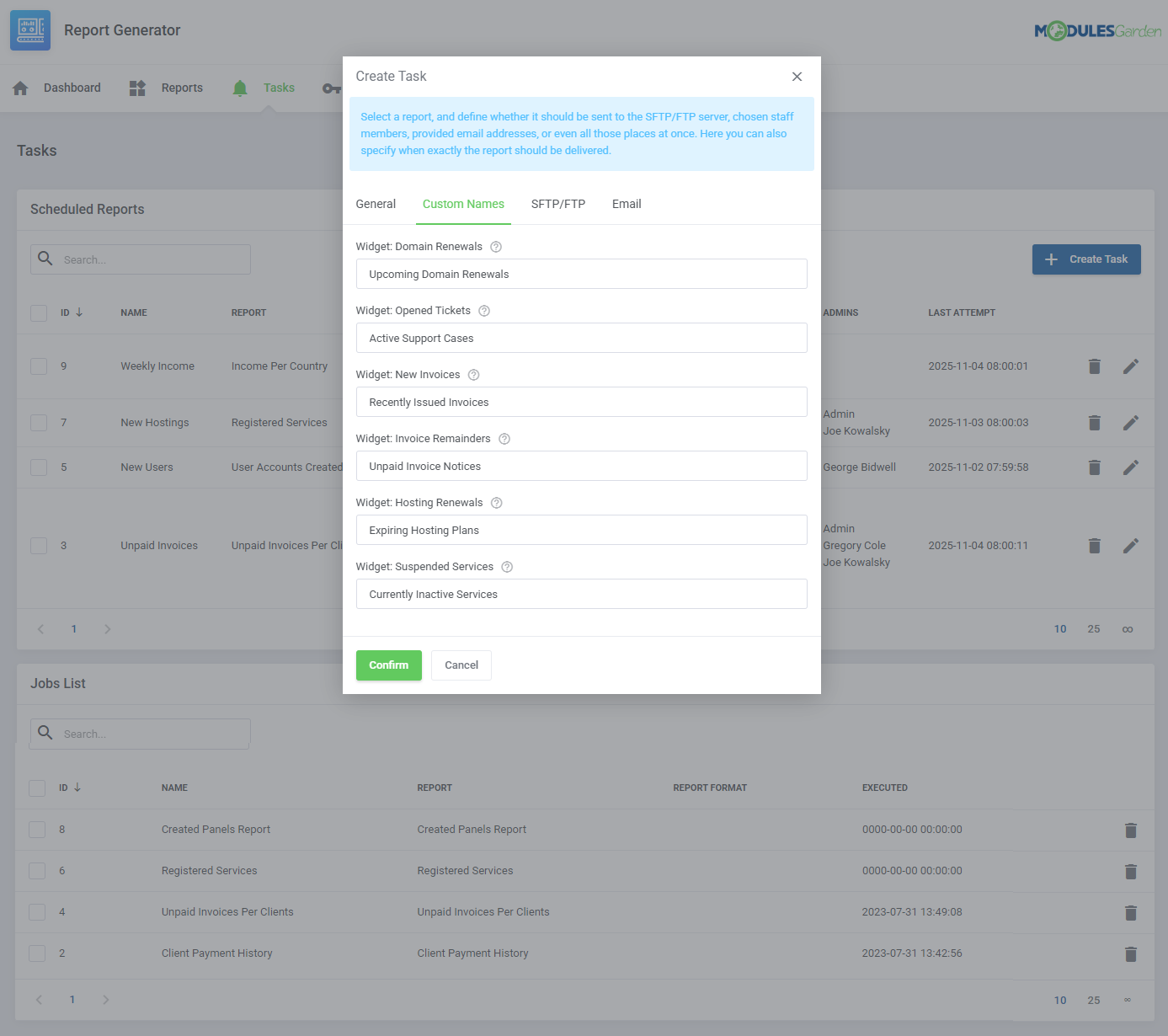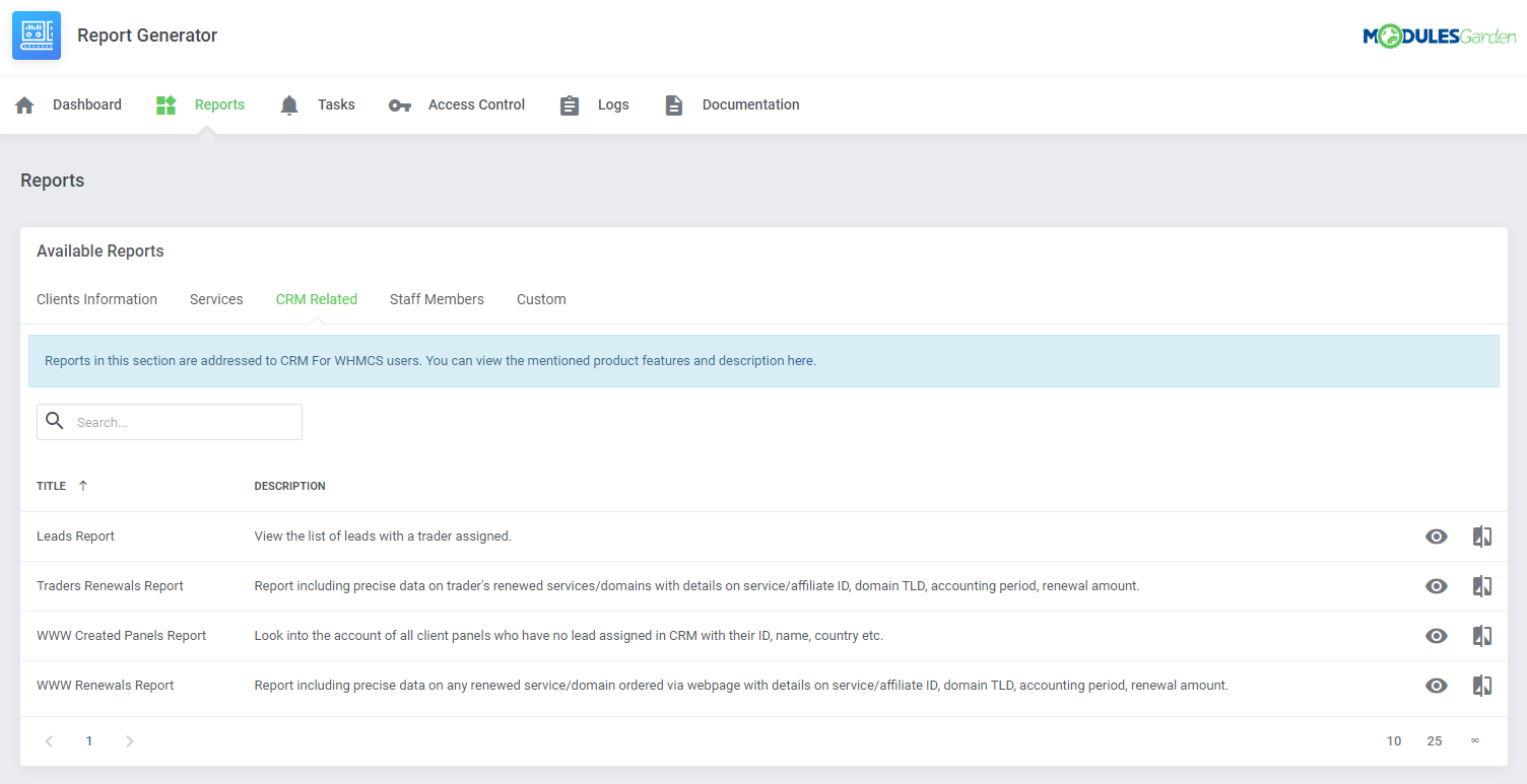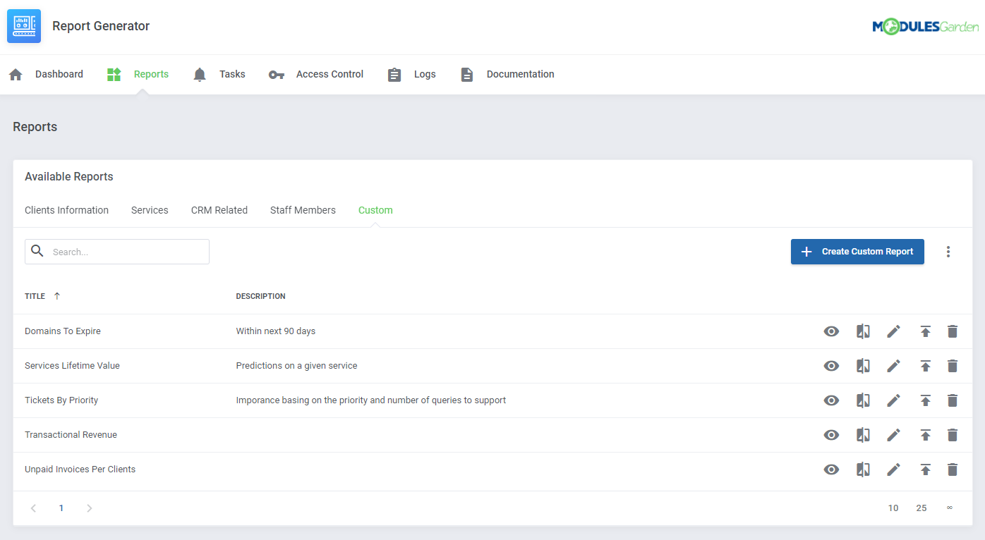 Report Generator para WHMCS te permite visualizar muchos reportes pre-diseñados y también generar reportes nuevos usando toda la información disponible en WHMCS.