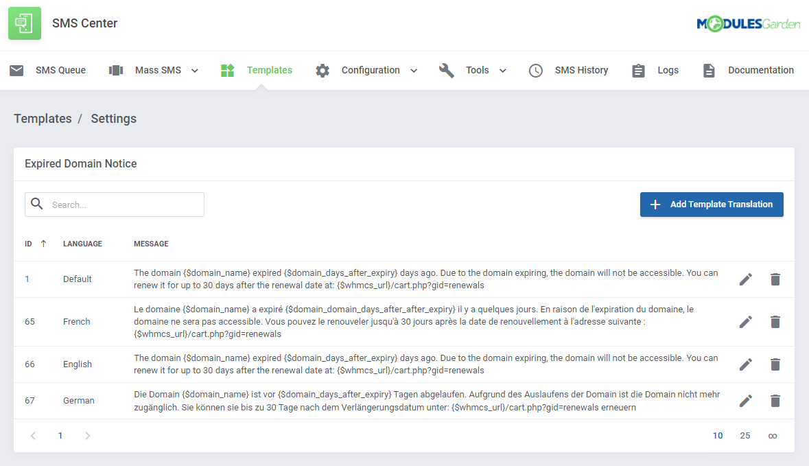 Este módulo te permite crear fácilmente plantillas de SMS editables que correspondan a las plantillas de correo de WHMCS, tanto las incluídas con el sistema, como las personalizadas. Podrás enviar mensajes de texto tan sencillo como seleccionar a un cliente o introducir un número de teléfono móvil. También podás enviar mensajes de texto a tu equipo de trabajo en eventos específicos tales como creación de tickets importantes o retrasos en pagos de facturas.