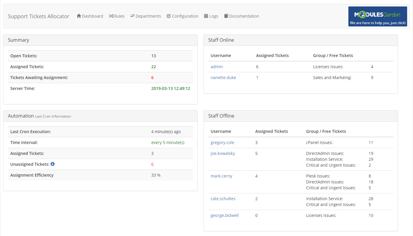 Support Tickets Allocator para WHMCS es un módulo que te permitirá ahorrar mucho tiempo al automatizar el proceso de asignación de tickets entre departamentos y usuarios en tu WHMCS.